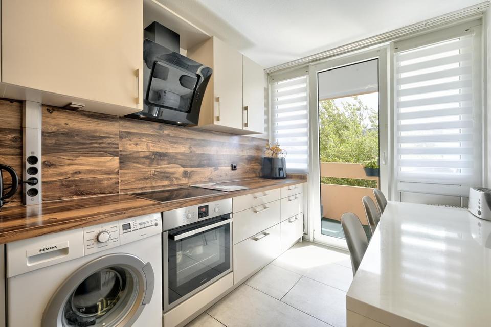 Wohnkomfort zum Verlieben: Die Wohnung strahlt Wärme aus – dank hochwertiger Ausstattung, moderner Laminatböden in den Wohnbereichen und neuen Fliesen in der Küche und gefliestes Bad und WC. Die Doppel-Isolierverglasung sorgt für ruhige Nächte und entspannte Tage, selbst in einer gut frequentierten Umgebung. Ein persönlicher Abstellraum in der Wohnung, ein Gemeinschaftswaschraum und ein eigener Fahrradkeller runden den praktischen Komfort ab.