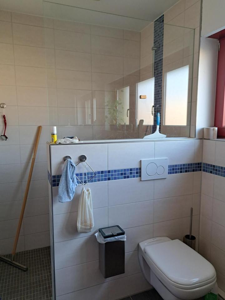 Im 1. OG befinden sich drei Schlafzimmer. Zwei mit Zugang zum Südbalkon, auf dem an kalten Sonnentagen wärmende Sonnenstrahlen zum Verweilen einladen. Zudem ein modernes Bad mit Dusche, WC und 2 Waschbecken mit vom Schreiner maßgefertigtem Unter- und Spiegelschrank.