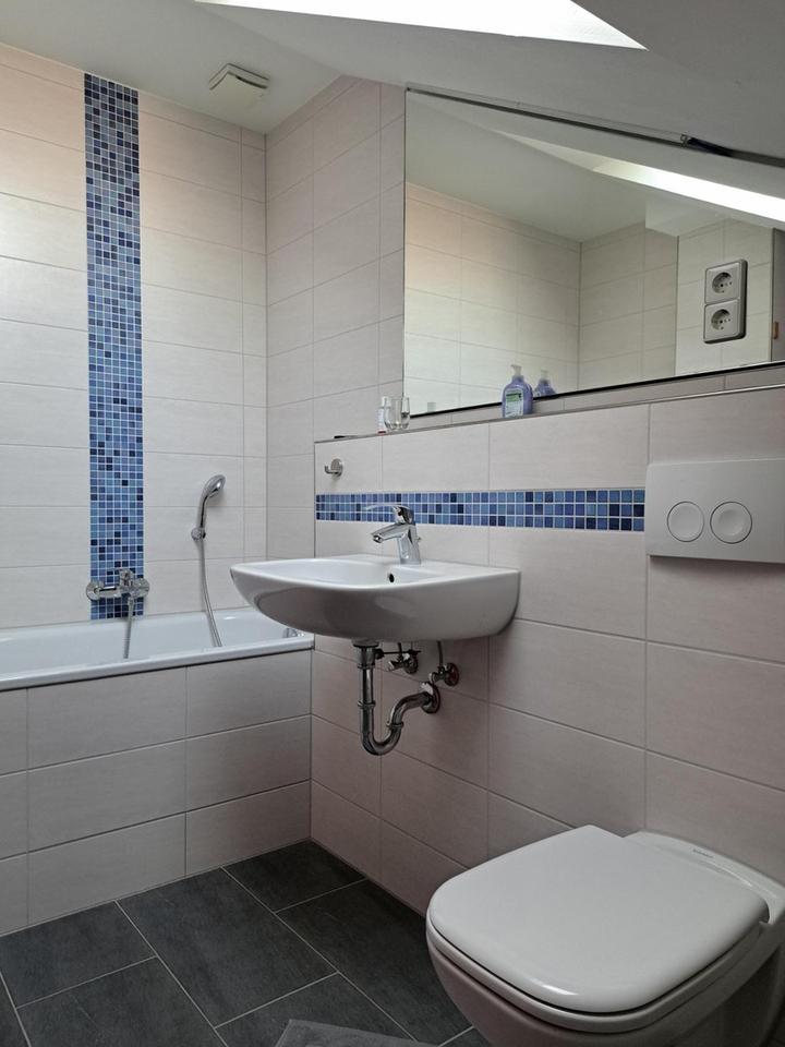 Im ausgebauten DG befindet sich ein weitläufiger Raum mit großzügiger Dachgaube und ein Bad mit Badewanne. Die Dachschräge im Flur lässt sich durch eingebaute Schiebeschränke praktisch als Stauraum nutzen.