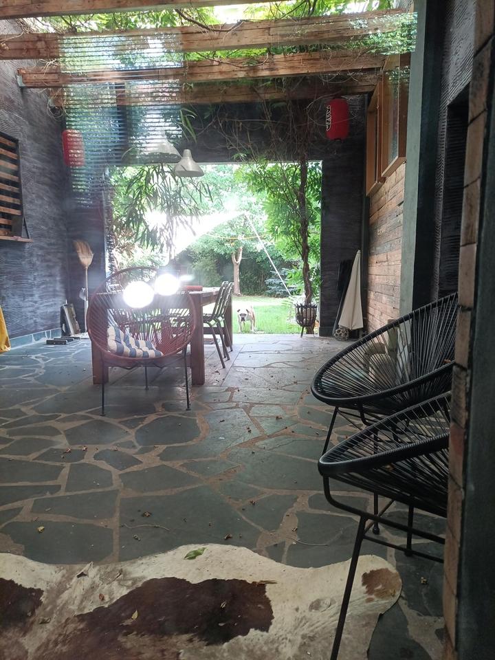 In den Garten gelangt man durch eine natürlich belichtete Loggia mit lebendiger, durchscheinender „Pflanzendecke“, ein trockener Übergang zwischen Innen und Außen. Im Garten stehen Obstbäume (Apfel, Pflaume, Kirsche), immergrüner Bambus, Lebensbäume/Zypressen und eine große Birke. Ein eigener Kompost ersetzt die städtisch nicht vorgesehene Grüne Tonne. Durch vier 300 Liter Regentonnen kann der Garten, besonders der Bambus, 6-8 Wochen ohne Trinkwasser versorgt werden.