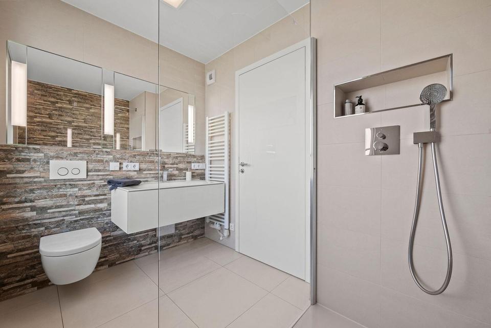 Das Badezimmer mit exquisiter Regendusche und großem eingebauten Spiegel-Wandschrank hebt sich deutlich von normalen Badezimmern ab.