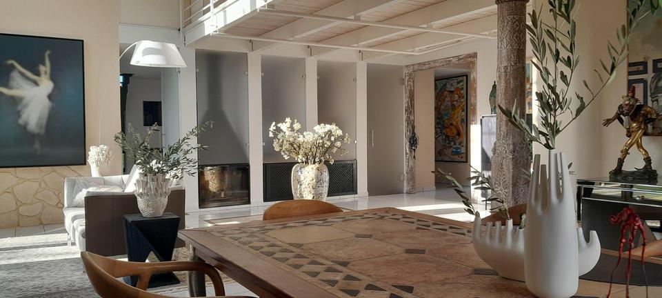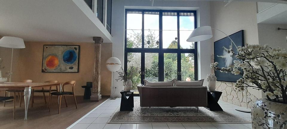 Großzügige, lichtdurchflutete Räume schaffen eine einladende Atmosphäre, während bodentiefe Galeriefenster das Tageslicht optimal einfangen. Durch die großen Fenster kann man die mediterrane Gestaltung des Gartens mit Zypressen und Olivenbäumen bewundern.