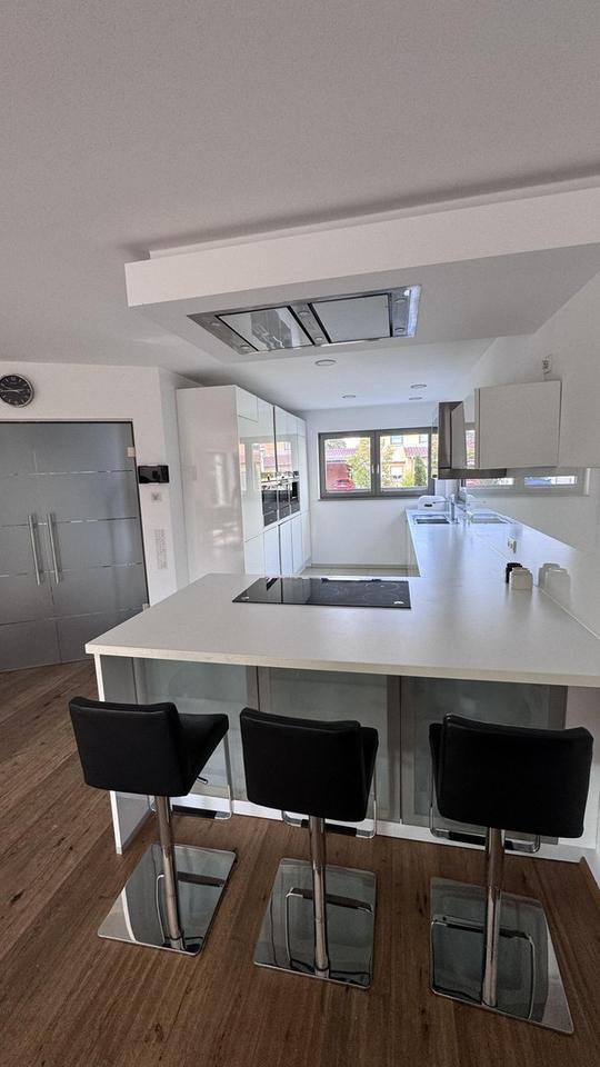 Die moderne Einbauküche, mit allen technischen Raffinessen (z.B. Dampfgarer) lädt mit den drei bequemen Sitzmöglichkeiten ein zum entspannten Verweilen und gemeinsamen Kochen.