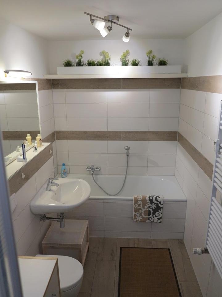 Auf der rechten Seite des Flurs befindet sich das Badezimmer mit Badewanne, später Dusche, WC, Handtuchheizkörper und Waschmaschinenanschluss.