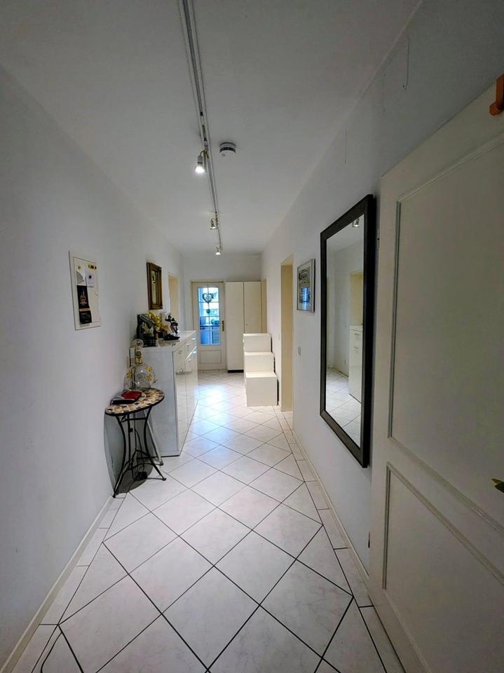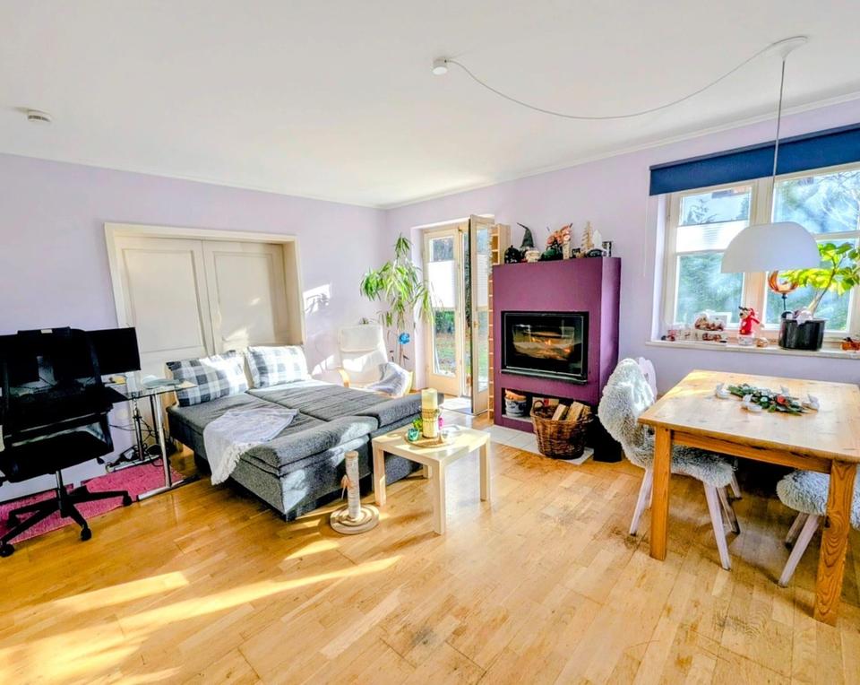 Im Erdgeschoss befindet sich eine 108 qm große Wohnung mit 4 Zimmern, 2 Bädern und einem Kaminofen im großen Wohnraum. Von hier hat man auch diverse Zugänge zu der umlaufenden Terrasse und dem großen eingewachsenem Garten mit altem Baumbestand.