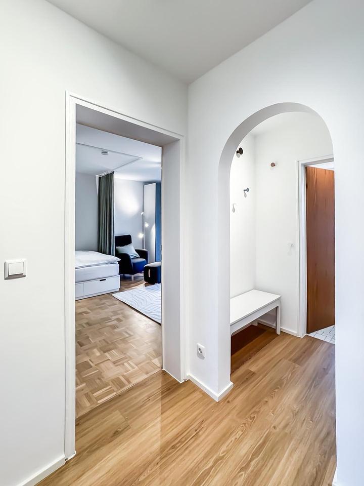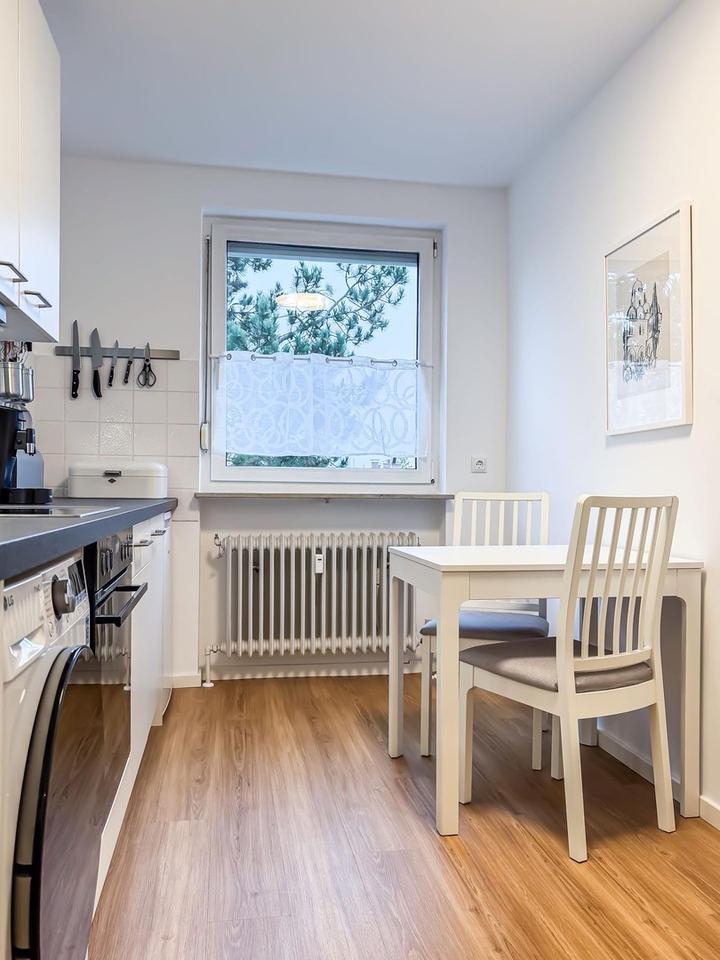 Die Wohnung besteht aus zwei voll möblierten Zimmern sowie einer großzügigen Küche, einem hellen Tageslicht-Badezimmer, einer Garderobe, einem Flur, einer Abstellkammer und verfügt über Geschirrspüler, Waschtrockner, zwei Kühlschränke und schnellem WLAN.