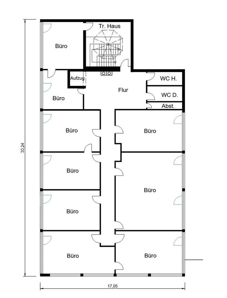 Die Fläche ist derzeit in 9 großzügige Büroräume aufgeteilt. Eine Änderung des Grundrisses ist grundsätzlich möglich.