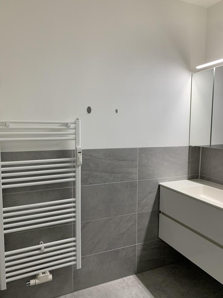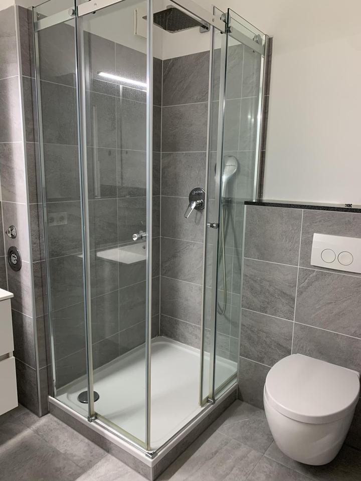Das Badezimmer erstrahlt in neuem Glanz mit einer modernen Glasduschkabine, einem stilvollen, möblierten Waschbecken sowie einem wandhängenden WC mit hochwertigen Armaturen. Ein elektrischer Abluftventilator sorgt in beiden Badezimmern für eine gute Luftzirkulation.