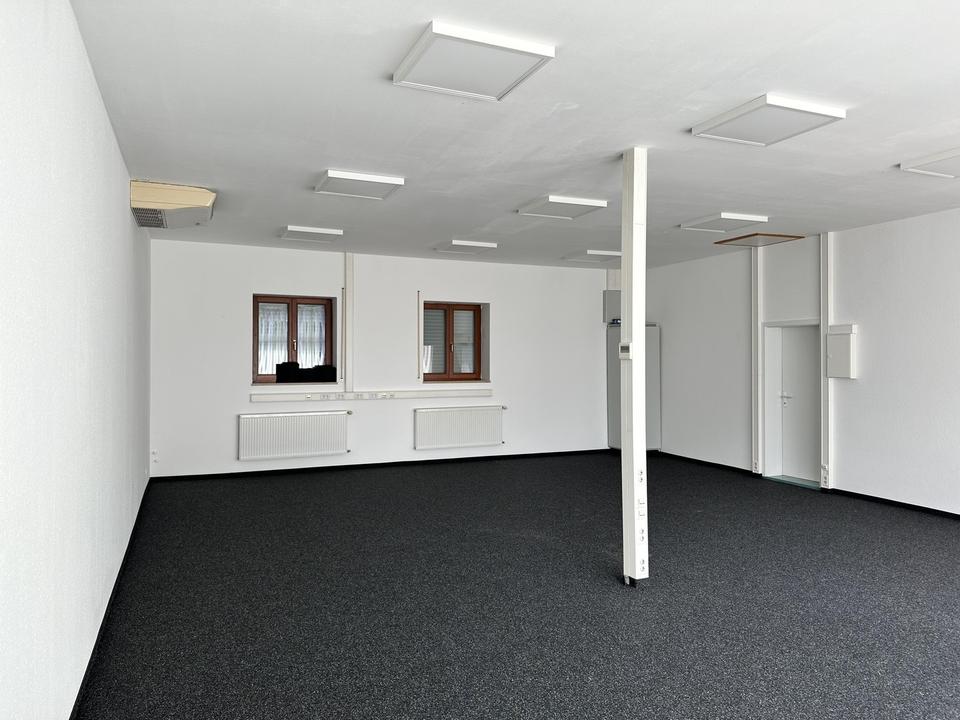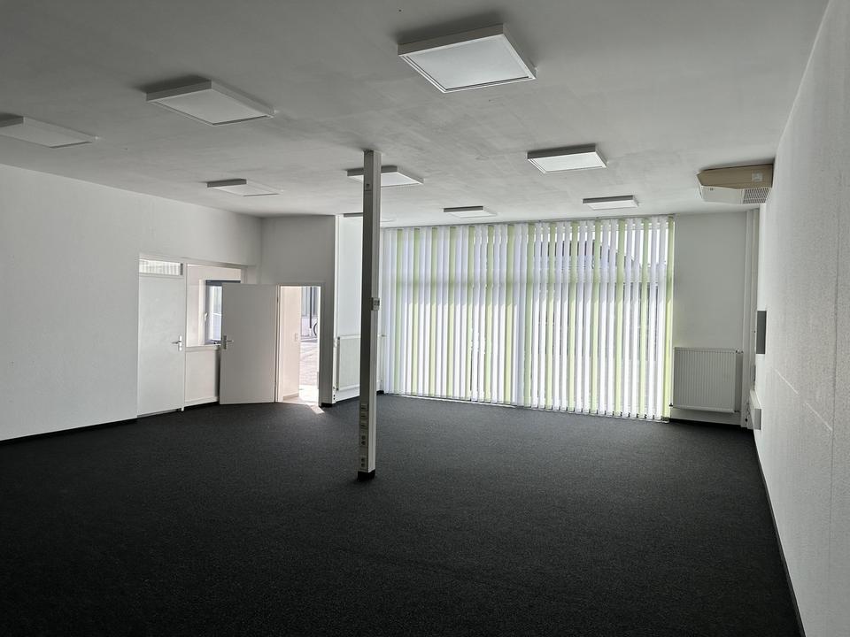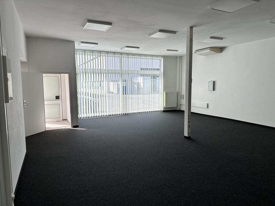 Ergänzend steht ein modernes Büro mit ca. 100 m² zur Verfügung, welches sich in unmittelbarer nähe zur Halle befindet. Dadurch sind kurze Wege zwischen Verwaltung und Produktion/Lager garantiert.