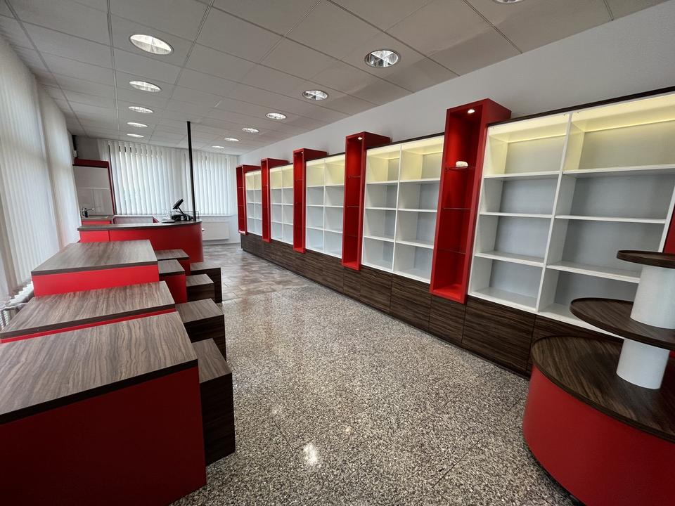 Sollten Sie als ein anderes Nutzungskonzept verfolgen, können der Ladentresen und die Verkaufstische bei Bedarf und nach Rücksprache entfernt werden. Die fest verbauten Regale sollten in der Gewerbeeinheit verbleiben.