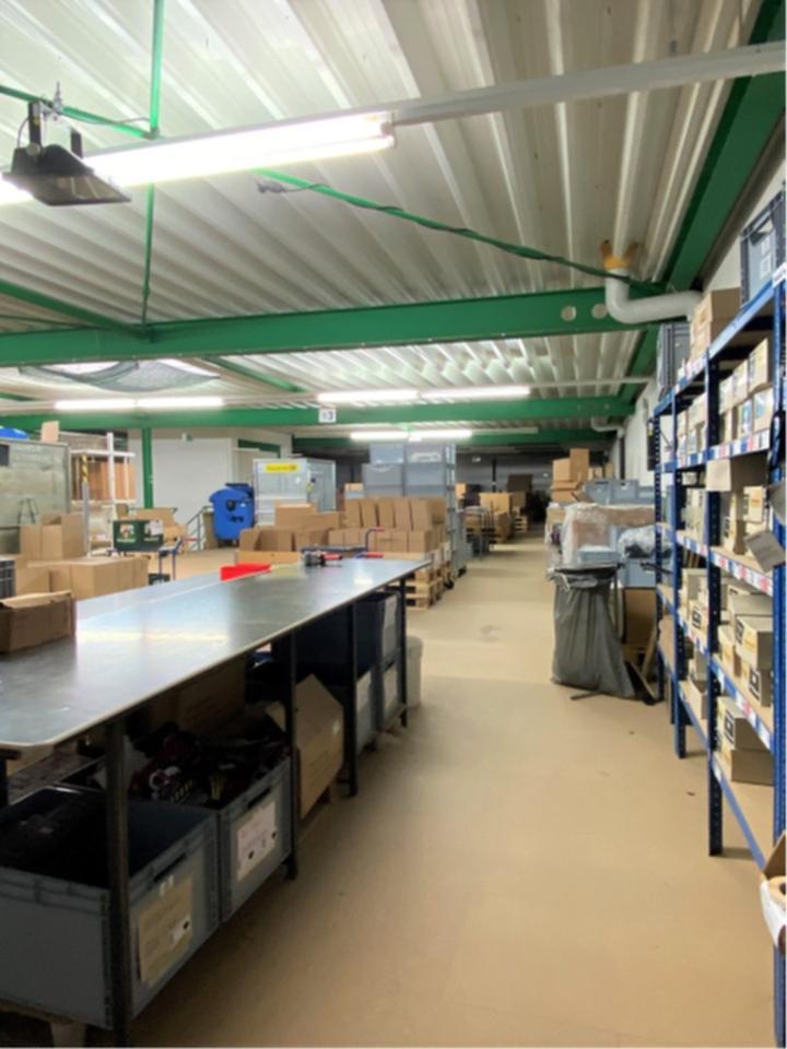 Die Halle verfügt über ein 4 Meter hohes und 3 Meter breites Rolltor, mit nach innen gebauter Schleuse mit Schnell-Lauftor. So verfügen sie über eine gute und barrierefreie Andienung. Mit dem Lastenaufzug, der über eine Tragkraft von 3 Tonnen verfügt, können sie problemlos ihre Waren in das rund 1.000 m² große Obergeschoss transportieren, welches über eine Deckenhöhe von 2,6 Metern verfügt. Im Erdgeschoss der Gewerbehalle integriert ist ein kleines Büro, mit Platz für 2 Arbeitsplätze.