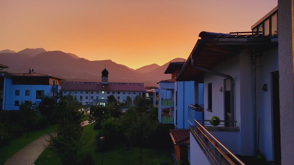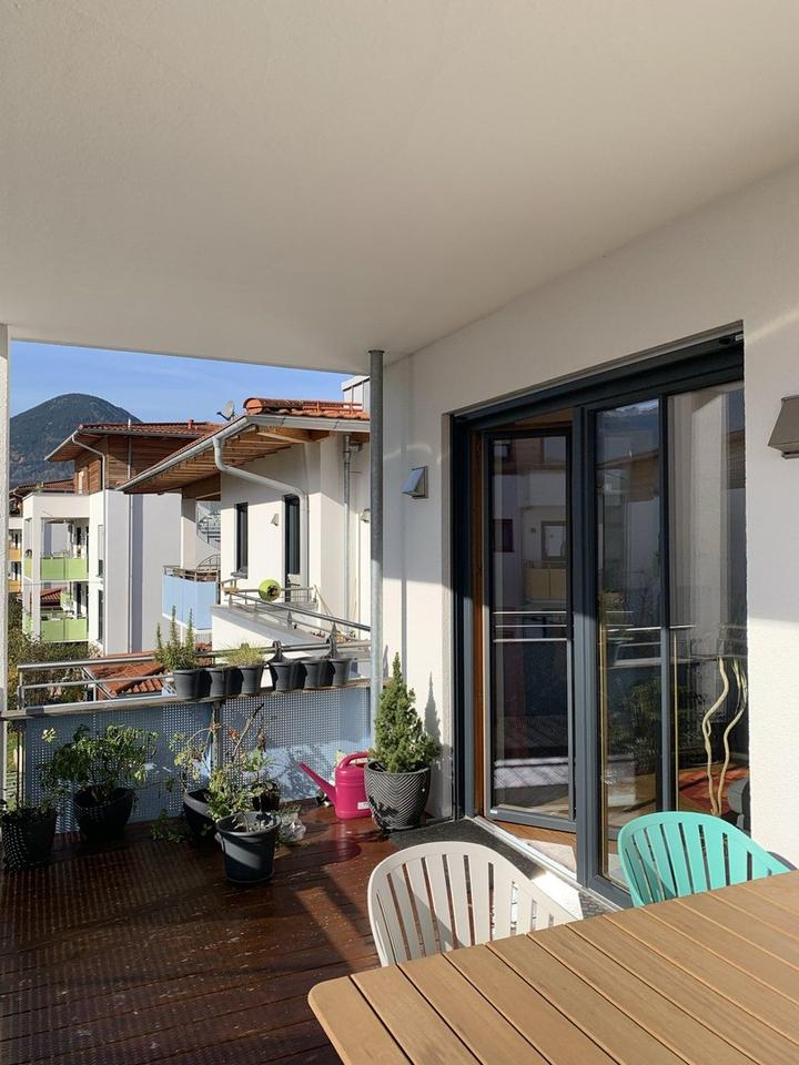 Der großzügige Balkon mit südlicher Ausrichtung ermöglicht den Blick in das schön gestaltete Umfeld der Anlage, sowie einen traumhaften Fernblick in das nahe und ferne Bergpanorama bis hin zum Kaisergebirge und dem Wendelstein.