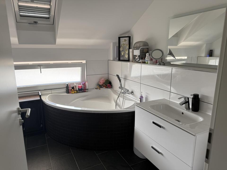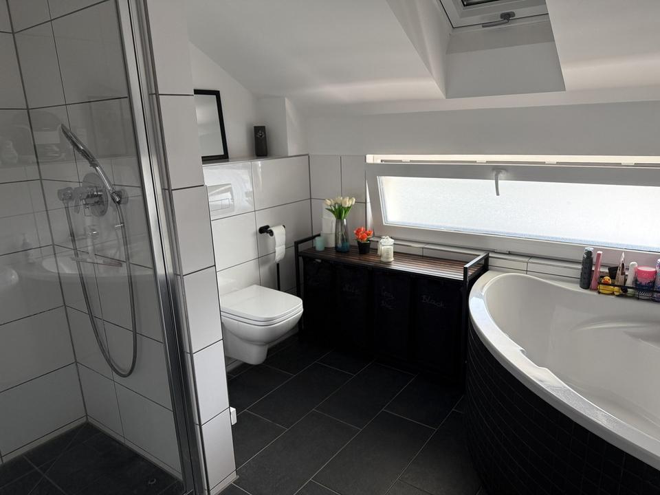 Badezimmer im Obergeschoss mit moderner Eckbadewanne und bodentiefer Dusche – perfekt zum Entspannen und Wohlfühlen
