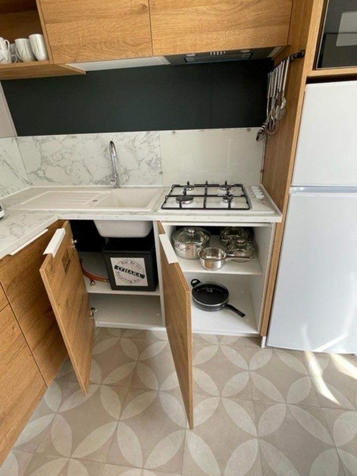 Voll ausgestattete Küche (Kühlschrank, Gasherd)