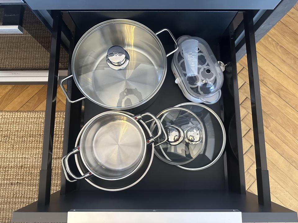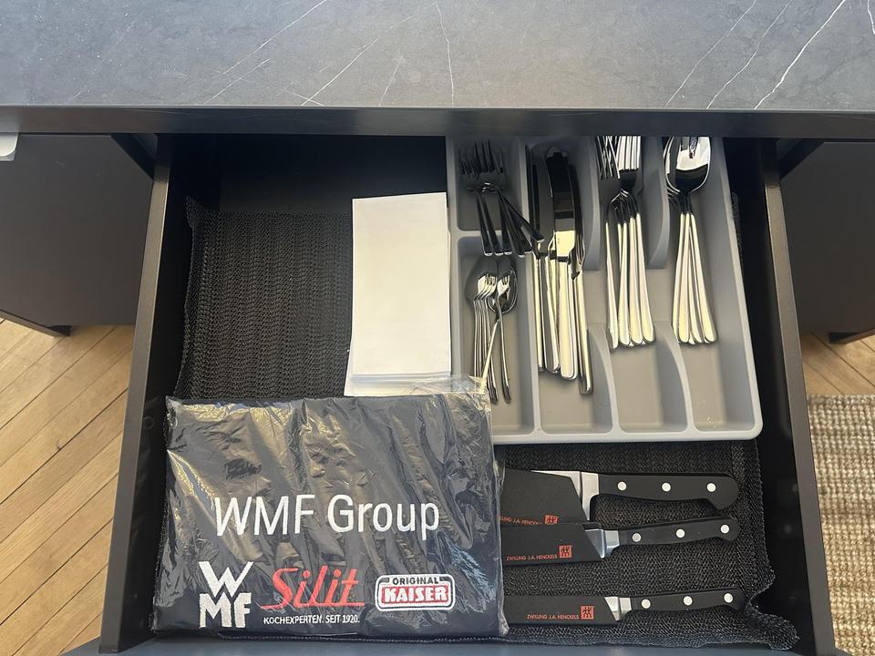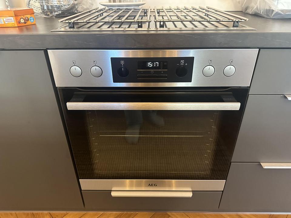 Küche: Moderne Einbauküche mit Cerankochfeld, Dunstabzug, Backofen, Spülmaschine, Kühl-Gefrierkombination, Kapsel-Kaffeemaschine, Wasserkocher und Geschirr