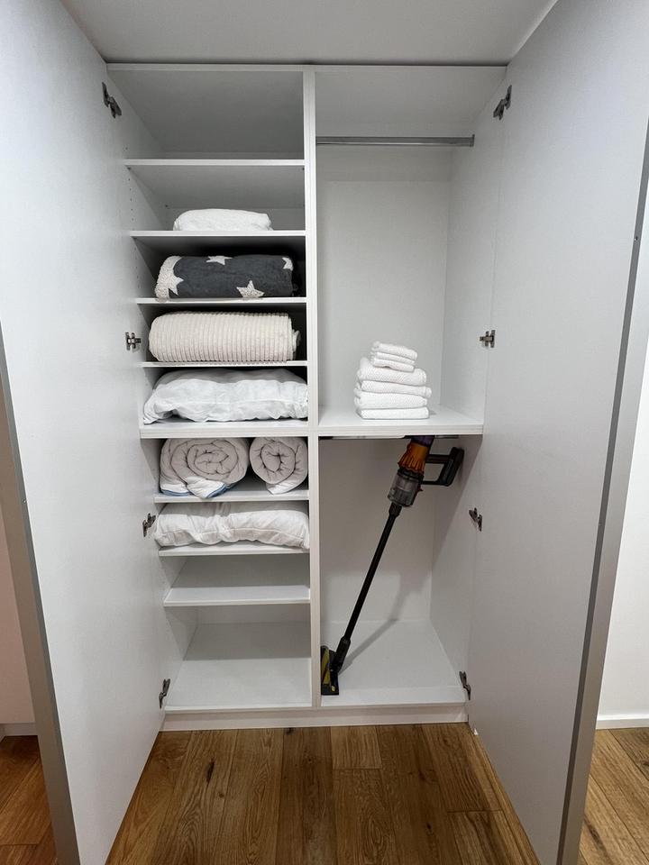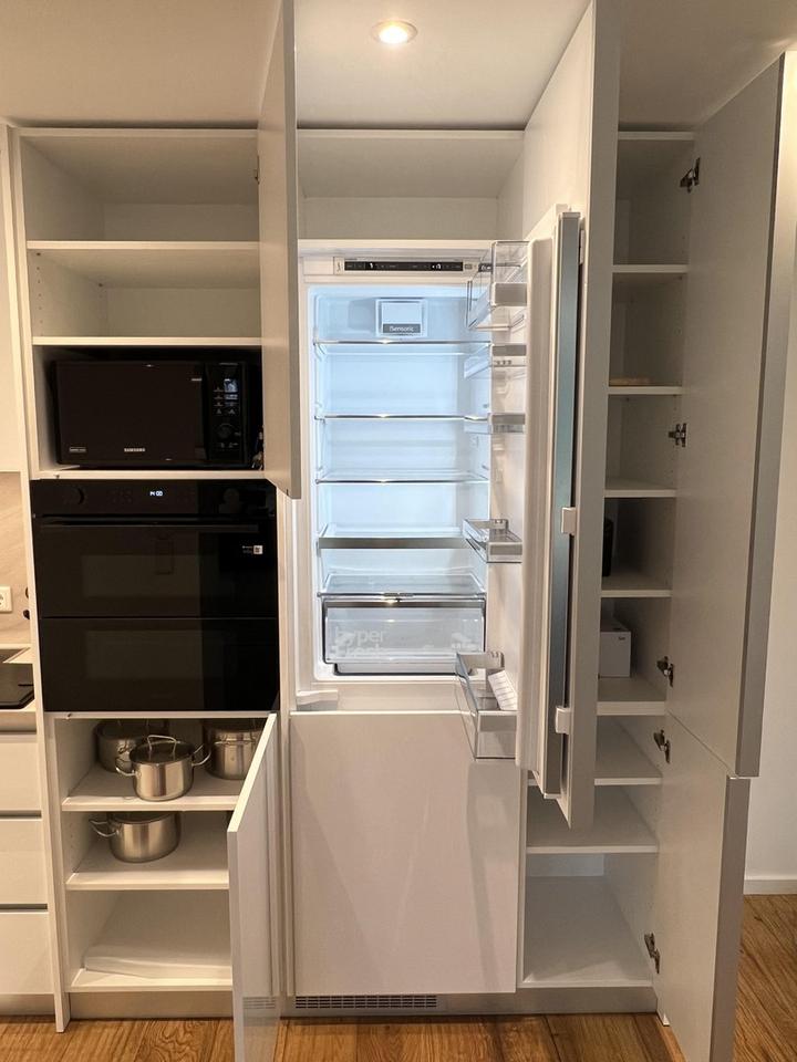 Die Wohnung verfügt über zwei großzügige Zimmer, einen offenen Wohn- und Essbereich sowie eine halboffene Küche mit hochwertigen Markengeräten (Siemens Kühl-/Gefrierkombination, Bosch Backofen, Delonghi Kaffeemaschine, LG Waschtrockner, Dyson Staubsauger).