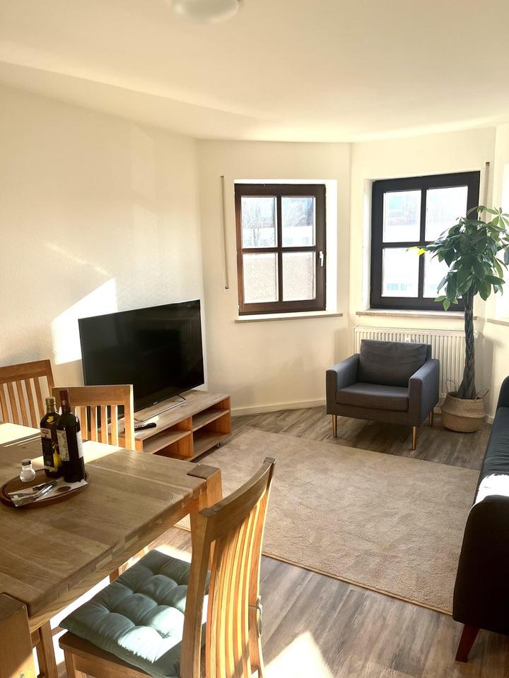 Zur weiteren Ausstattung gehören WLAN, Waschmaschine, Fernseher sowie Bettwäsche und Handtücher. Die Möblierung ist gepflegt und funktional, sodass die Wohnung sofort bezogen werden kann.