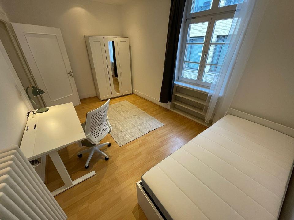 Jedes Zimmer ist separat abschließbar, teilmöbliert (je nach Ausstattung: Bett, Schrank, Tisch, Stuhl) und verfügt über große Fenster mit viel Tageslicht. Die WG teilt sich eine geräumige Eingangsbereich, eine neuwertige Einbauküche, ein modernes Tageslichtbad mit Dusche sowie WC.