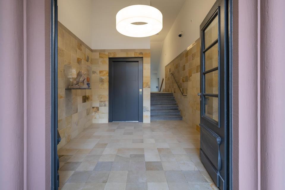 Die Erschließung erfolgt zentral über das Haupttreppenhaus. Alle Geschosse sind mit dem Aufzug erreichbar, überwiegend barrierefrei, wie auch die Flächen im Untergeschoss. Im Untergeschoss befindet sich ein Wasch- und Trockenraum für die Bewohner, in dem Waschmaschinen und Trockner über einen Münzautomaten benutzt werden können. Waschmaschinen in den Wohngeschossen sind nicht gewollt.