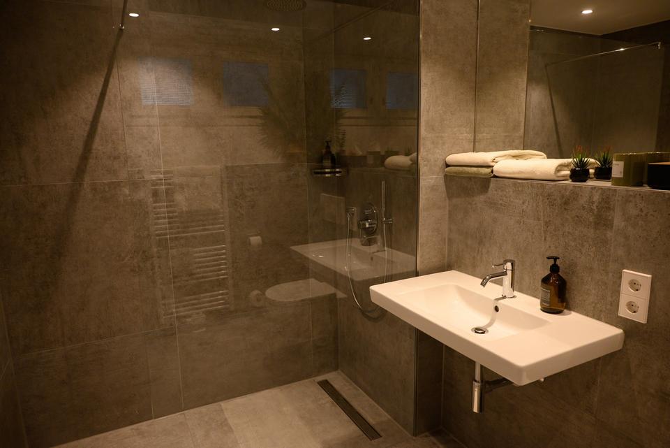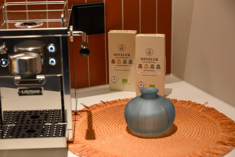 Die moderne Einbauküche ist hochwertig ausgestattet und fügt sich perfekt in das stilvolle Ambiente des Apartments ein – ideal zum entspannten Kochen oder für den schnellen Espresso am Morgen.