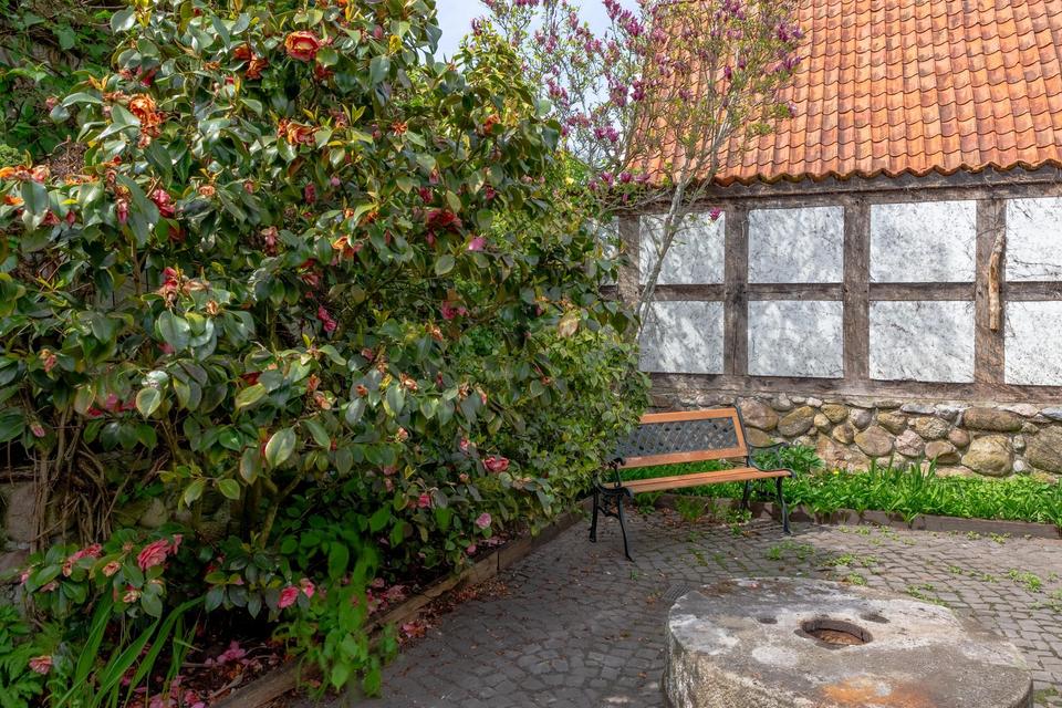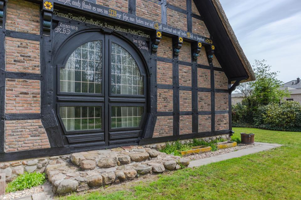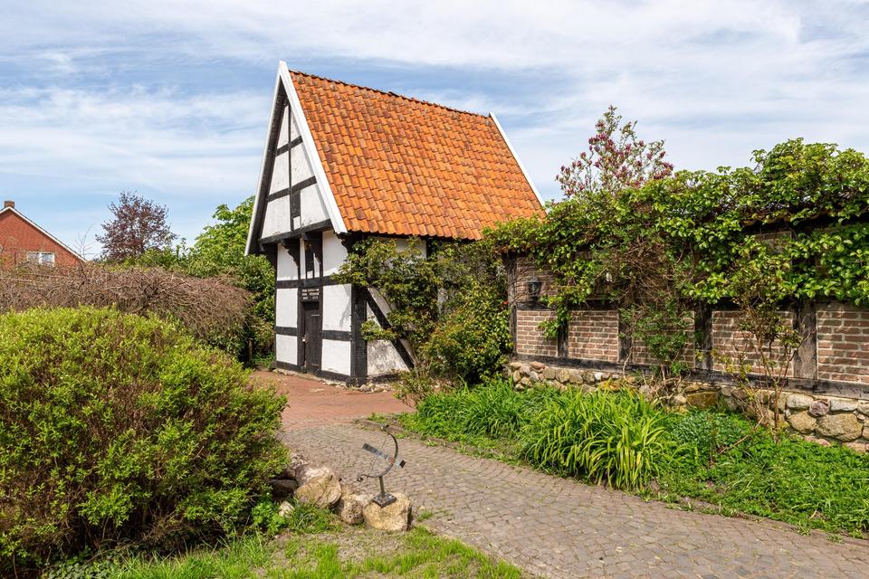 Das reetgedeckte Fachwerkhaus liegt auf einem liebevoll gestalteten, ca. 1.650 m² Grundstück, in direkter Lage am Stadtpark u. Fischteichen von Friesoythe. Über eine massive Holzbrücke gelangt man auf das Grundstück, wo sich Wohnhaus, Spiker, Carport u. Pergola befinden.