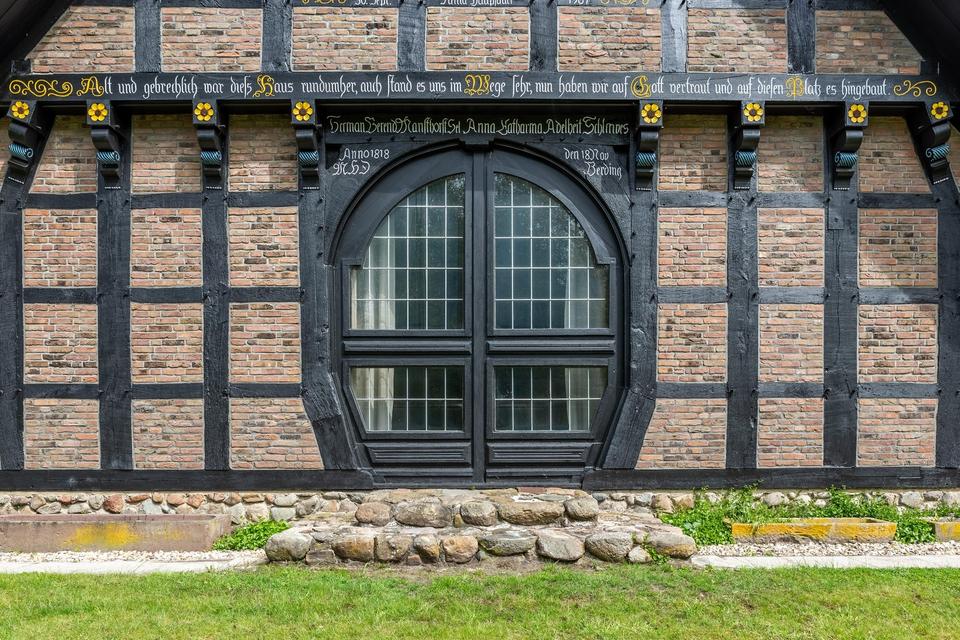 • Außenmauerwerk zweischalig: Außenschale aus altem Eichenholzfachwerk mit Klinkersteinen aus Ammerländer Bauernhäusern, Hohlschicht, innere Schale aus weiß gestrichenem Kalksandstein