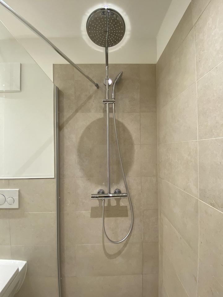 – Bathroom with ceiling spotlights – modern and timeless tiling