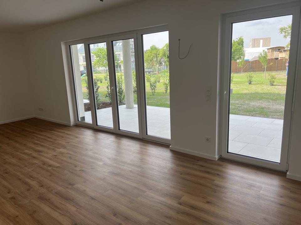 Eine über 4 Meter breite Fensterfront zur großen und ebenerdigen Terrasse lässt viel Licht in den Wohn und Essbereich. Von der Wohnung gelangt man direkt in den großen Garten und auf die neu angelegte Obstwiese, die zum Haus gehört.