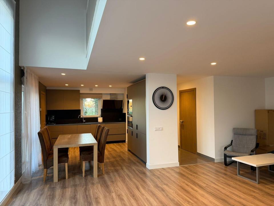 Im Erdgeschoss befindet sich ein geräumiges, helles Wohnzimmer kombiniert mit einer Küche und Essbereich, von dem aus man Ausgang auf die Terrasse hat. Ebenfalls im Erdgeschoss gibt es einen separaten Raum, der als Büro oder Gästezimmer genutzt werden kann, sowie ein Badezimmer mit WC und Dusche. Von der Küche ist direkt Hauswirtschaftsraum/Waschraum erreichbar.