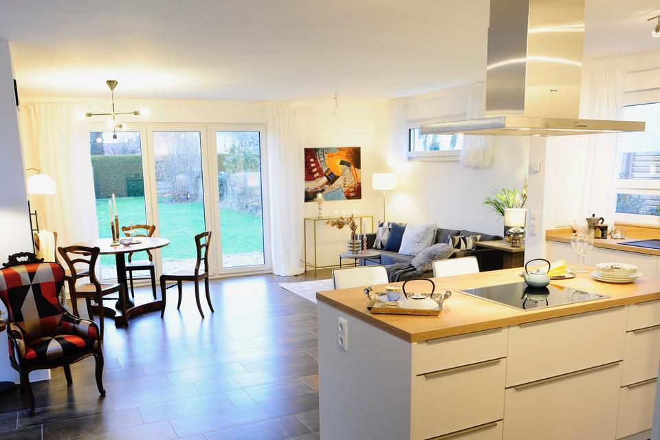 Der sehr großzügige offene Wohn-/Essbereich mit Kochinsel und verglastem Holzofen lädt zu gemütlichen Stunden mit Ausblick auf den eingewachsenen großen Garten.