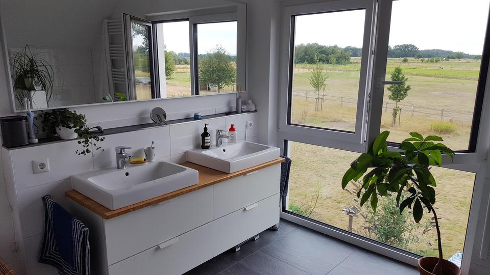 Das Bad im Dachgeschoss ist mit Doppelwaschtischen, großer Walkin-Dusche und Badewanne ausgestattet.