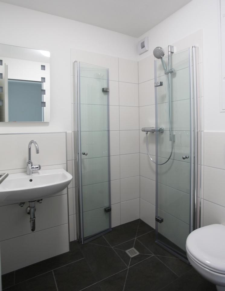 – vollwertig ausgestattetes Bad mit WC und Dusche.