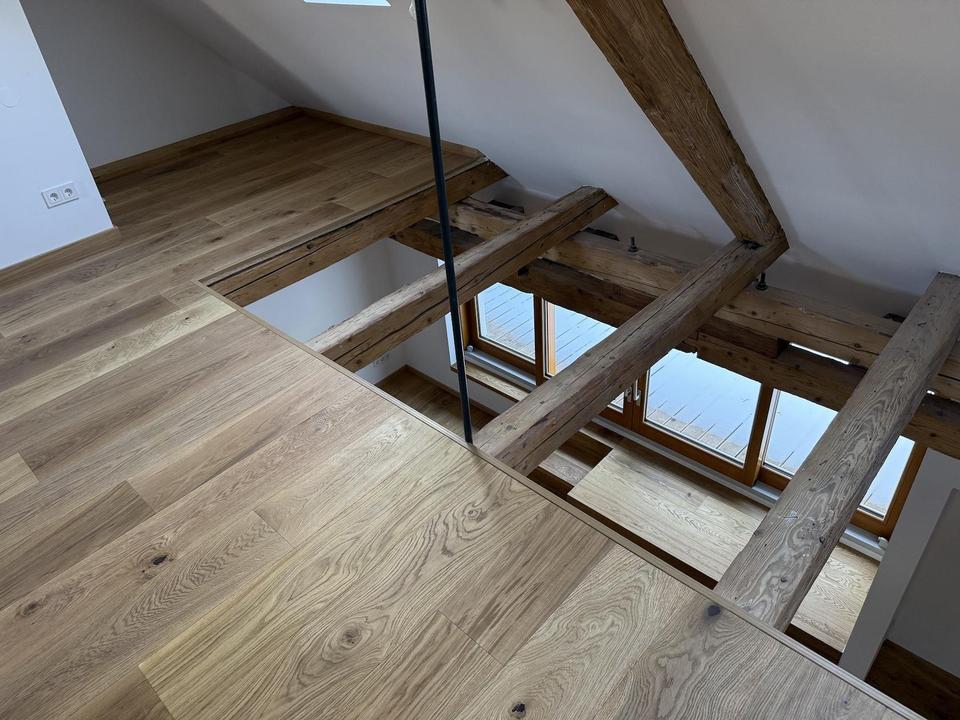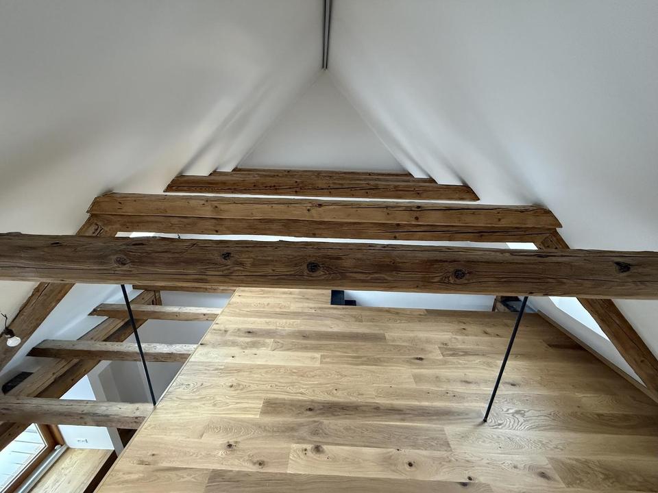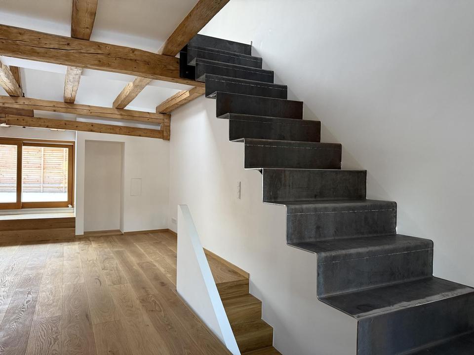 Das Haus bietet einen unverbaubaren Blick auf die Iller, kombiniert mit einer geschützten, ca. 25 m² großen Dachterrasse auf der ruhigen Innenseite. Sichtbare Holzbalken, eine teilweise offene Galerie im Dachgeschoss sowie die freigelegte Stadtmauer machen die Geschichte des Hauses erlebbar – ohne auf modernen Wohnkomfort zu verzichten.