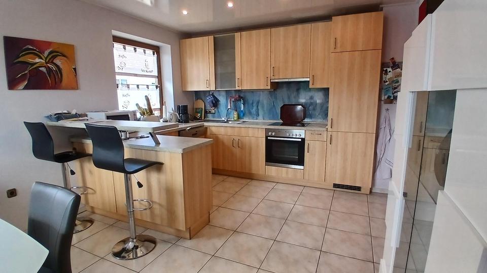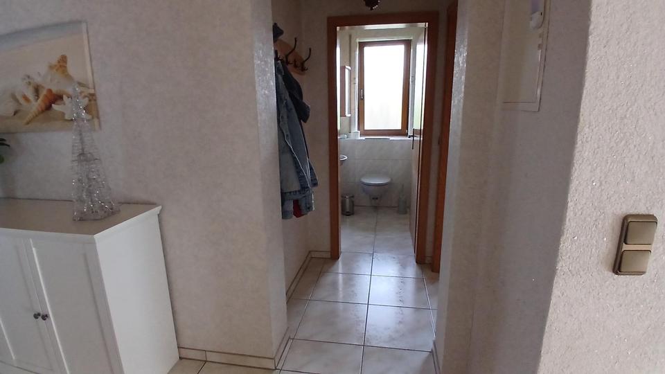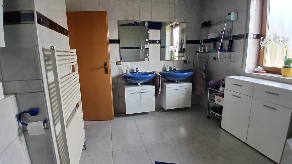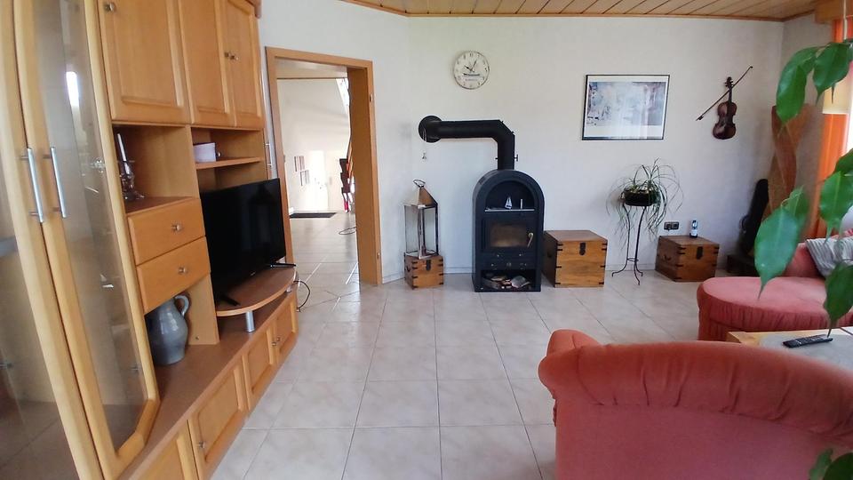 Im Erdgeschoss befinden sich eine große Wohnküche, ein Schlafzimmer, ein Wohnzimmer mit Kaminofen, ein Büro/Kinderzimmer, ein großes Bad mit Eckbadewanne und Dusche sowie ein Gäste-WC.