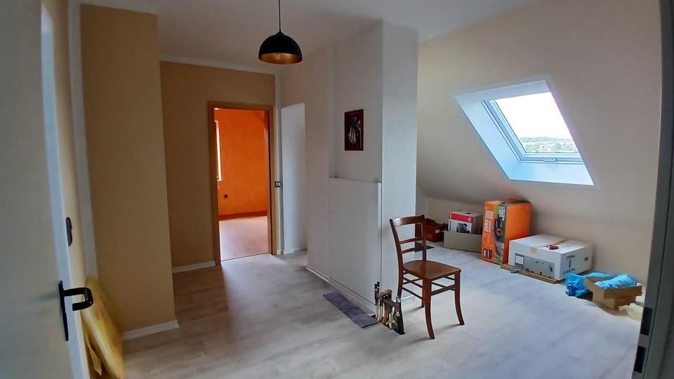 Im Dachgeschoss befinden sich drei weitere Zimmer, die als Kinder-, Gäste- oder Hobbyzimmer genutzt werden können. Die Installationen für den Einbau eines weiteren Badezimmers im Dachgeschoss sind vorhanden. Zusätzlich befindet sich im DG noch ein überdachter Balkon mit Blick in Grüne.