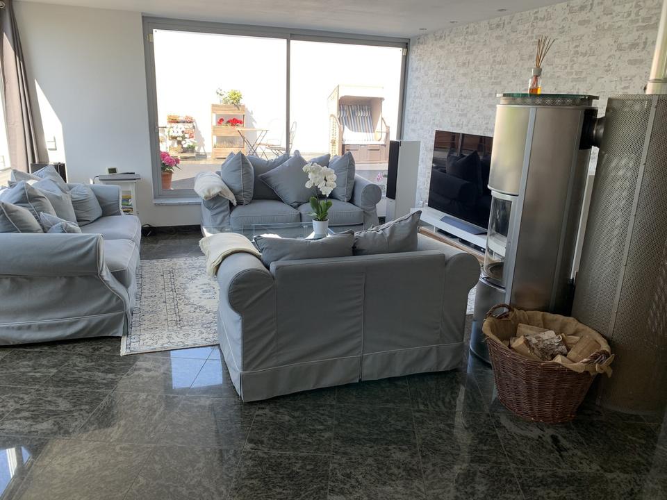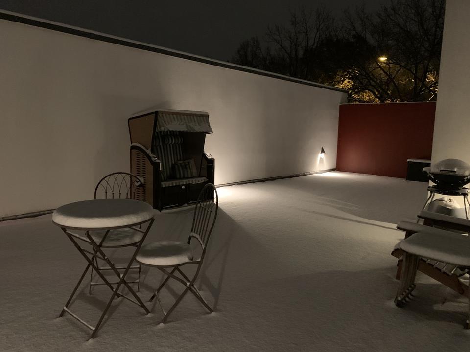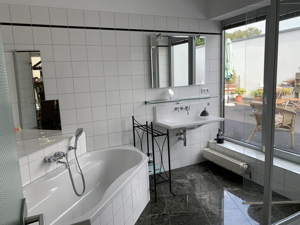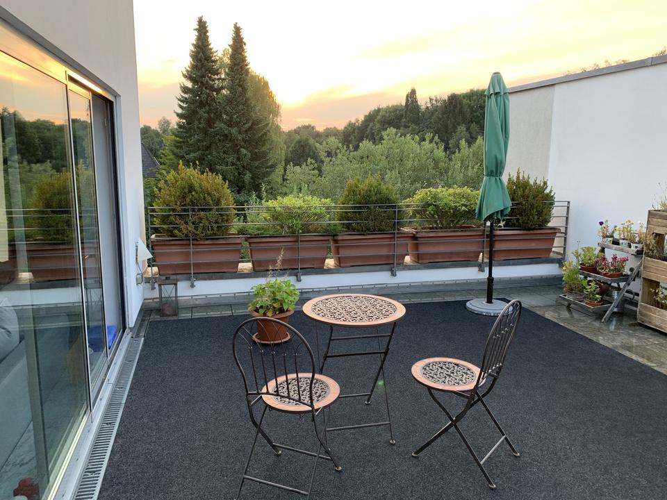 Eine Besonderheit ist, dass es nicht nur einen Balkon und eine sonnige ~60m² uneinsehbare Dachterrasse gibt, sondern Sie auch den Garten (mit Springbrunnen) nach hinten am Haus zu Ihrer Erholung nutzen können.