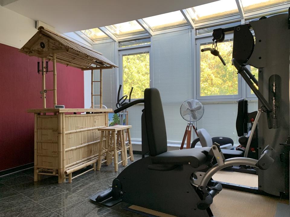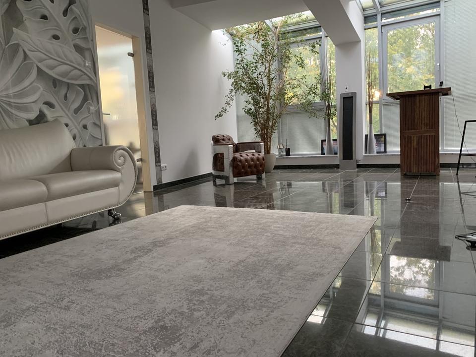 Das Raumklima- und Gefühl ist Jahreszeiten unabhängig sehr angenehm, bedingt durch den durchgängigen Granitboden mit Fußbodenheizung, die südöstliche-Fensterfront über automatische Außensonnensegel abzuschatten ist (incl. Oberlichter), der Wohnraum bis 4,5m hoch und mit 84m² (Wohn-Esszimmer) großzügig gestaltet ist.