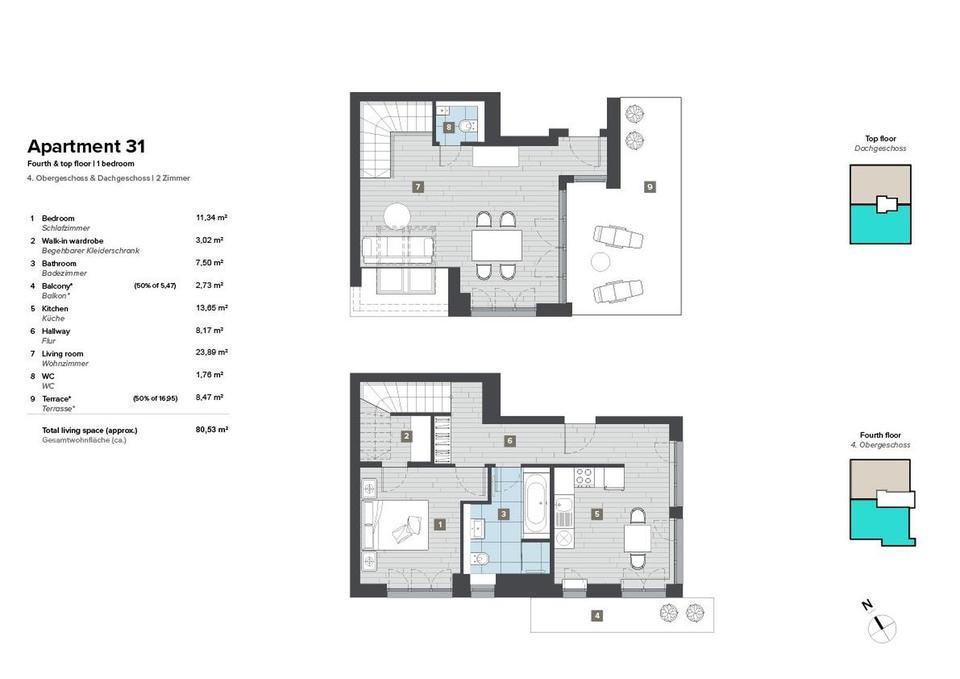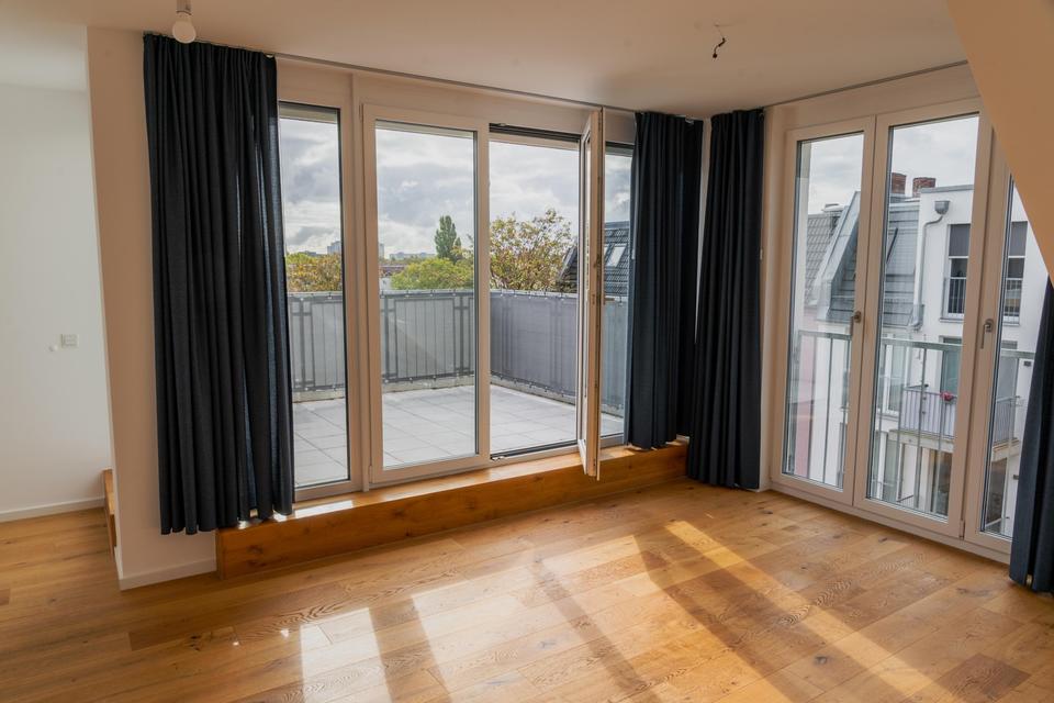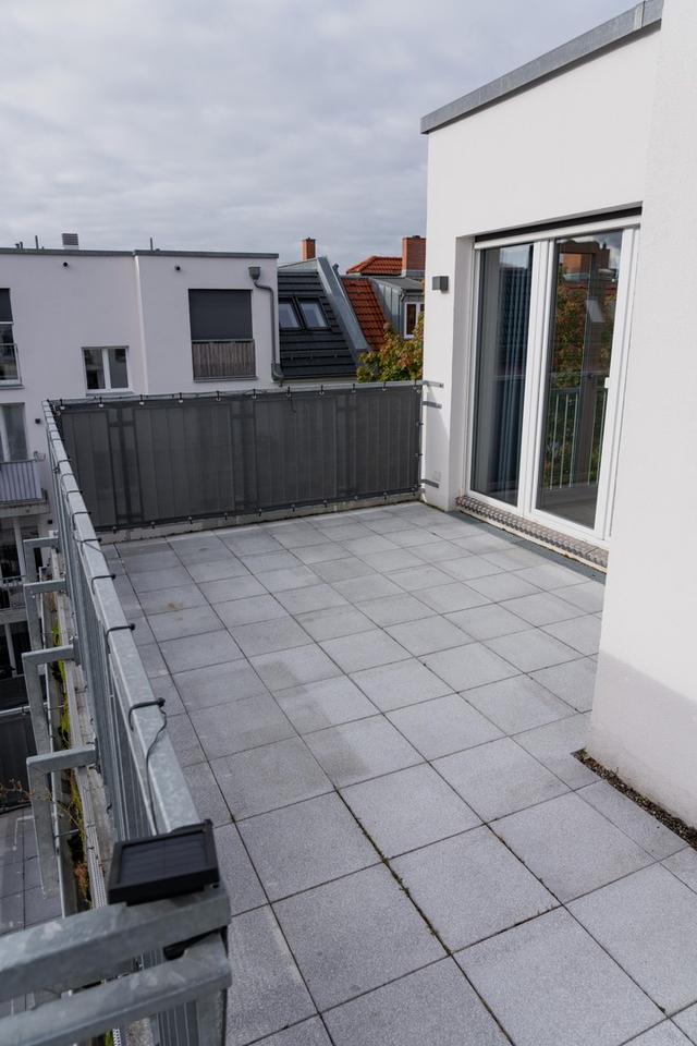 Über die Treppe geht es in die 5. Etage. Dort befindet sich ein großzügiges Wohn- & Arbeitszimmer, sowie eine separate Gästetoilette. Vom Wohnzimmer geht es über die Terrassentür auf die großzügige 17m² Dachterrasse, die eine Ost/Süd- Ausrichtung hat und einem weiten Blick über die anliegenden Häuser bietet. Der Grundriss ist zweckmäßig, zeitgemäß und modern ausgeführt. Die im Nov. 2025 vollständig neu renovierte Wohnung, kann ab sofort genutzt werden.