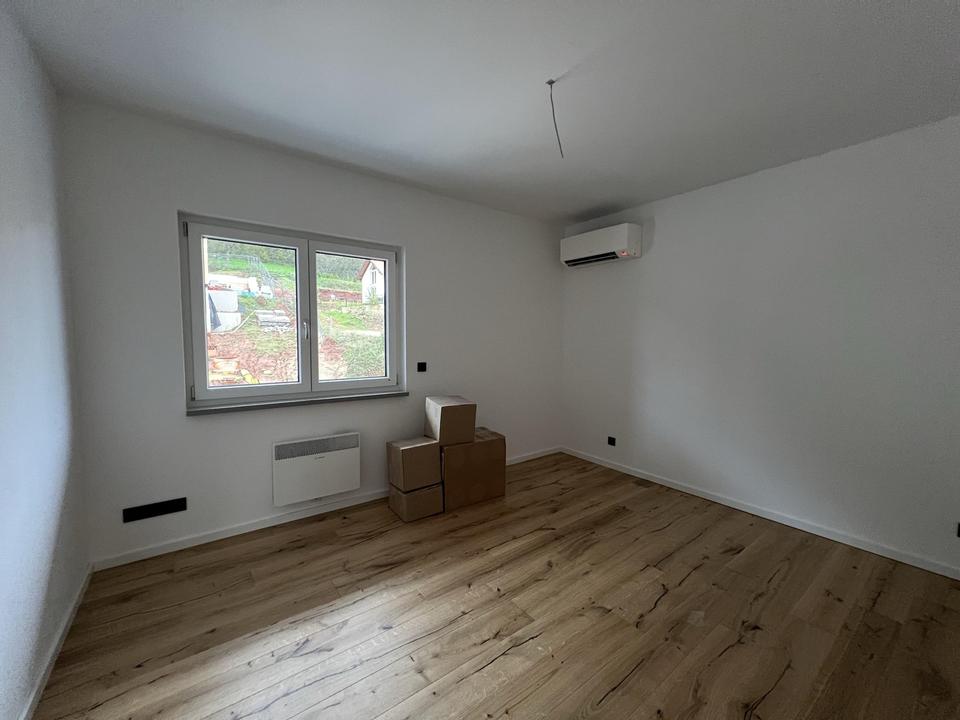 Wohnzimmerwand sind in Fliessen Natursteinoptik ausgeführt. Die Wohn- und Schlafräume haben Parkettböden (Eiche Natur).