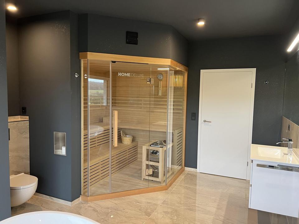 Wellnessbad mit Ausblick auf den Odenwald: Große Sauna, freistehende Badewanne mit Whirlpool, bodenebene Regendusche.