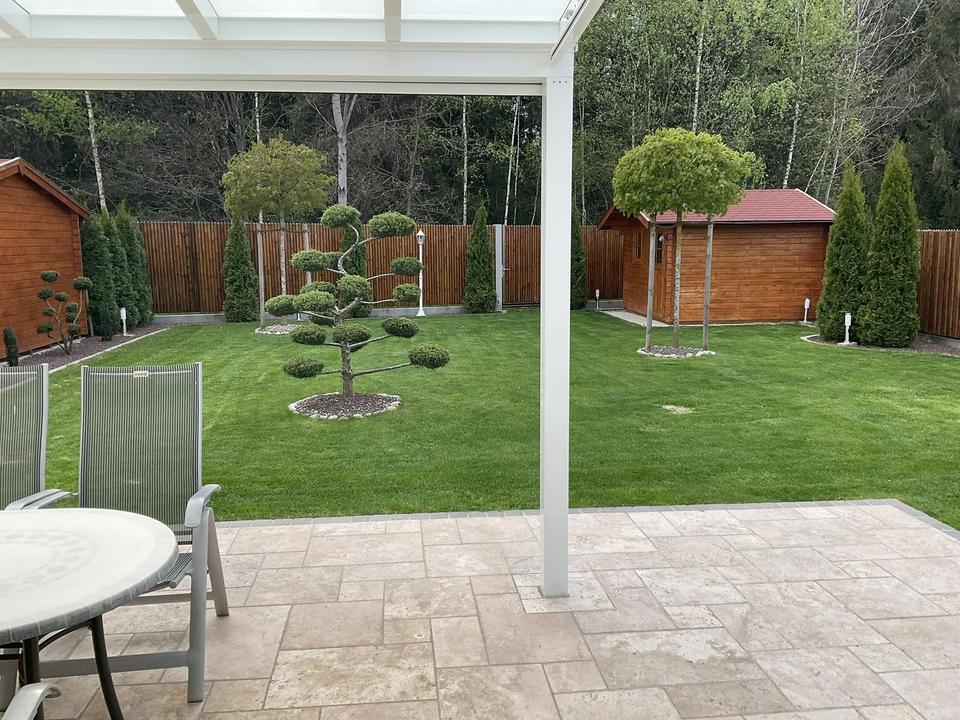– Perfekt angelegter Garten mit Bonsais und großem Gartenhaus