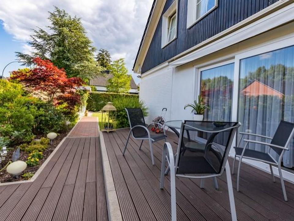 Der liebevoll gestaltete Garten mit zwei elektrischen Markisen und einer großen Bankirai-Terrasse (ca. 70 m²) bietet perfekte Voraussetzungen zum Entspannen und Genießen.