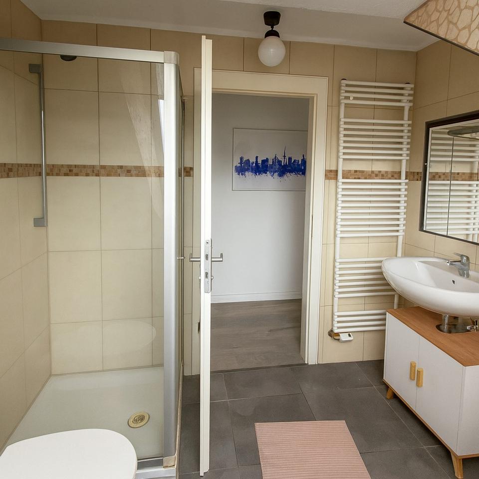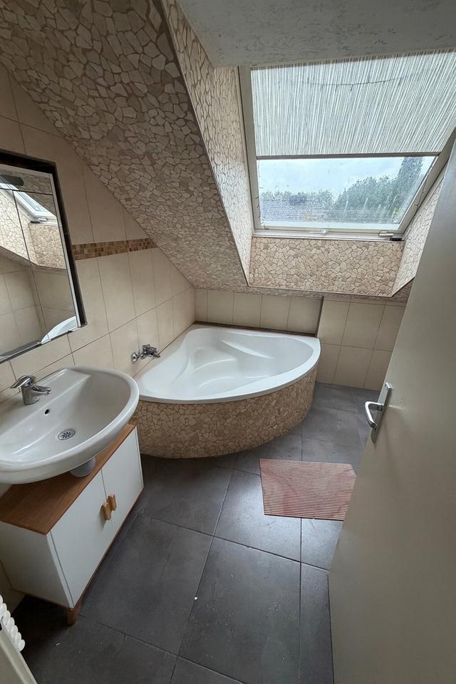 Das Obergeschoss bietet ein großes Vollbad mit eleganter Acrylwanne und separater Dusche, das durch seine Helligkeit und hochwertige Ausstattung überzeugt.