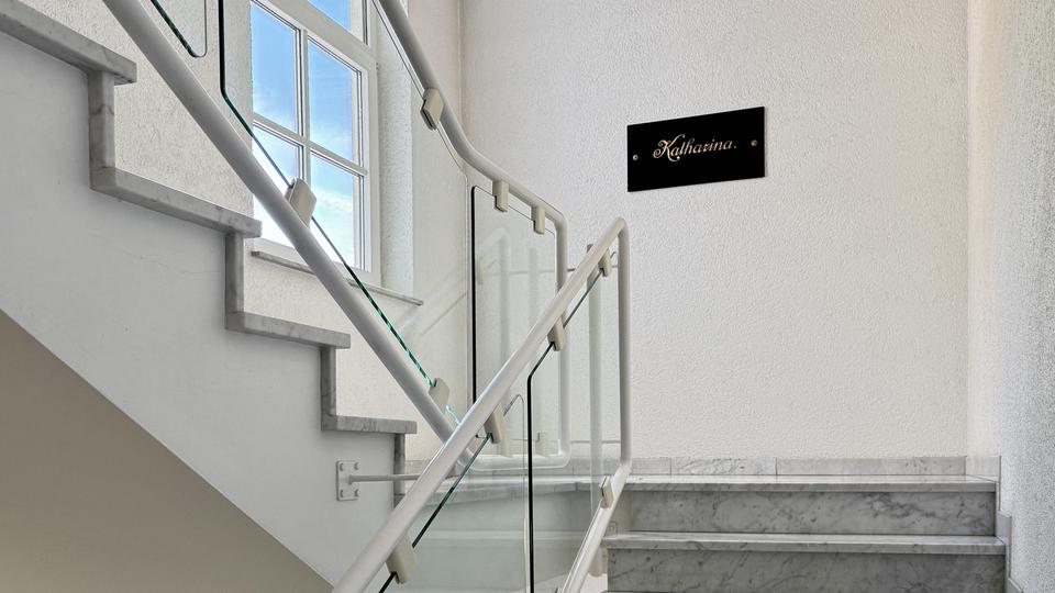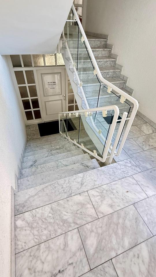 Das Treppenhaus ist komplett mit weißem Carrara Marmor ausgestattet und bietet ein repräsentatives Ambiente. Die Praxisräume haben eine Deckenhöhe von 2,7 m und große lichtdurchflutete Fenster. Dadurch wird der Raumeindruck positiv gesteigert. Die Fußbodenheizung bietet ein gutes Raumklima. Das Parkett und der Stuck runden diesen Eindruck ab.