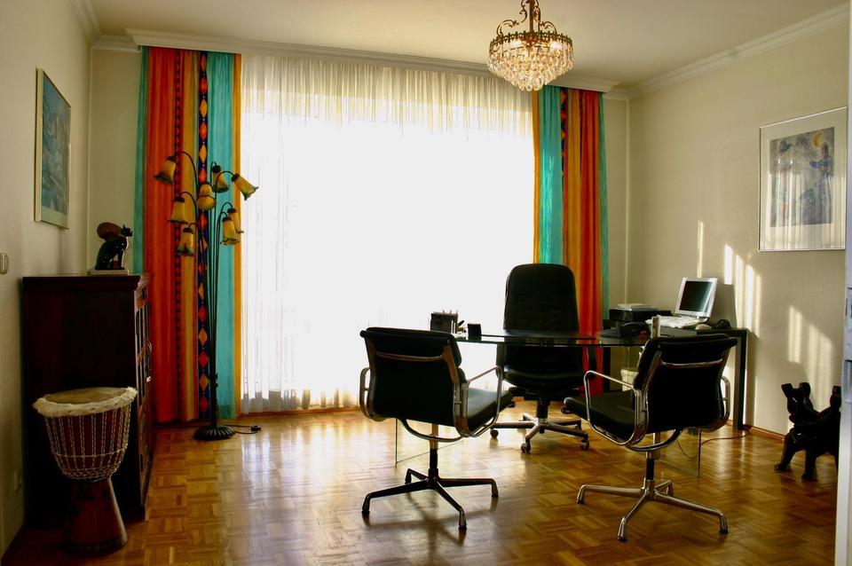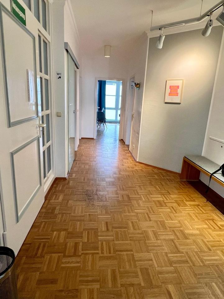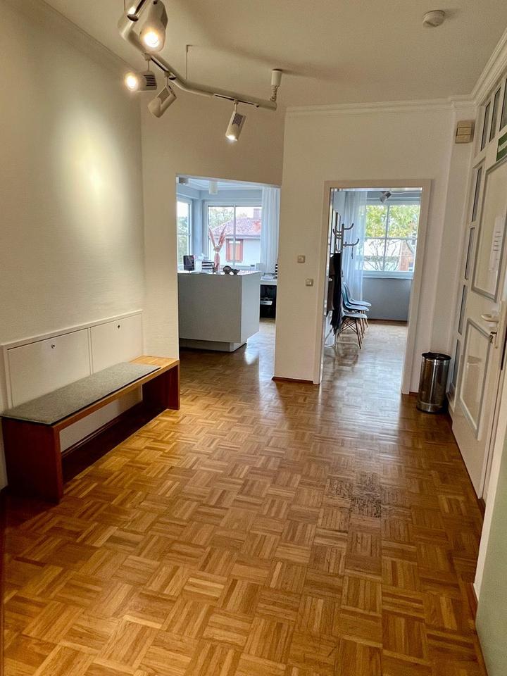 Die Räume sind lichtdurchflutet, haben eine Deckenhöhe von 2,7 m, Fußbodenheizung, und einen versiegelten Parkettboden. Zur Praxis gehören ein Archivraum im Keller und drei Stellplätze.