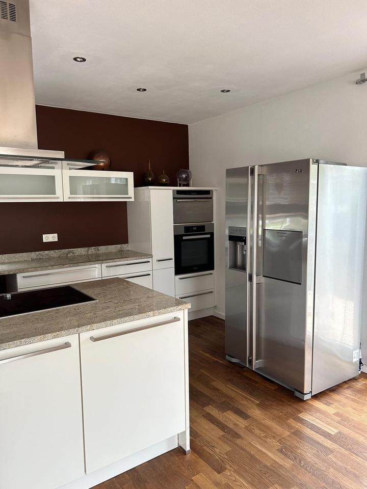 Die Einbauküche im Einfamilienhaus verfügt über eine Kochinsel und Granitarbeitsplatte sowie sehr guten elektronischen Einbaugeräten einem Side by Side Kühlschrank mit Eiswürfelbereiter, Induktionskochfeld und Dampfgarer u.a.. Die Küchenzeile in der Einliegerwohnung verfügt ebenfalls über eine Granitarbeitsplatte und Einbaugeräten. Die Schlafräume im Einfamilienhaus verfügen alle über einen begehbaren Kleiderschrank. Ebenso verfügt das Grundstück über einen sehr schön angelegten Garten in Südausrichtung mit kleinem Pool.