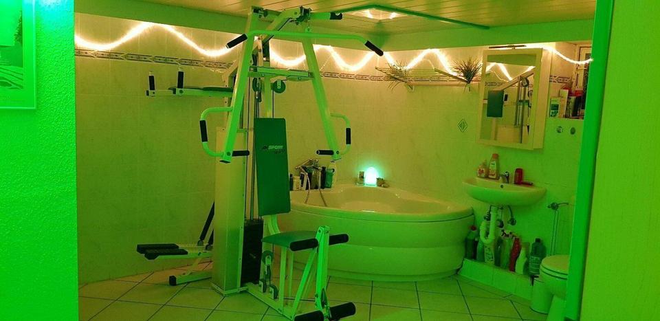 UG: 6-Zim-Wohnkeller im unteren Bereich mit ca. 110 qm Wohnfläche, dieser hat eine Höhe von ca. 2,2 m und wurde wohnlich ausgebaut, Flur, Saunabereich, Fitnessbereich, Waschraum mit Whirlpool und WC – OHNE HEBEANLAGE, Heimkino mit 4×2,2m Bildfläche + Partyraum, Gästezimmer, Raum mit Regalen und einer Außentreppe.