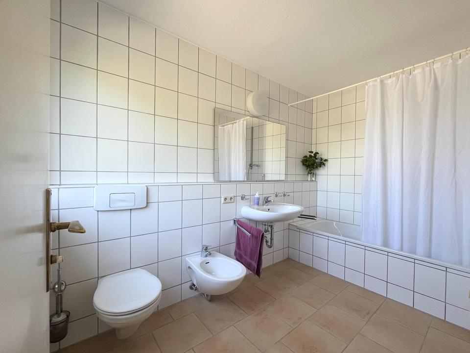 Großer Wohnraum mit offenem Kamin und Balkon, Küche und Essplatz mit direktem Ausgang auf den Gartensitzplatz, sowie ein Hauswirtschaftsraum und ein Badezimmer. Das Bad verfügt über 1 Waschbecken, Badewanne, 1 Bidet, sowie 1 WC.