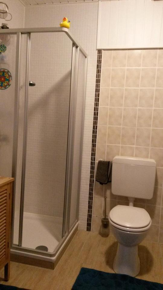 Das Bad ist zeitlos hell gefließt, mit Dusche und Abstellplatz für Waschmaschine und Trockner