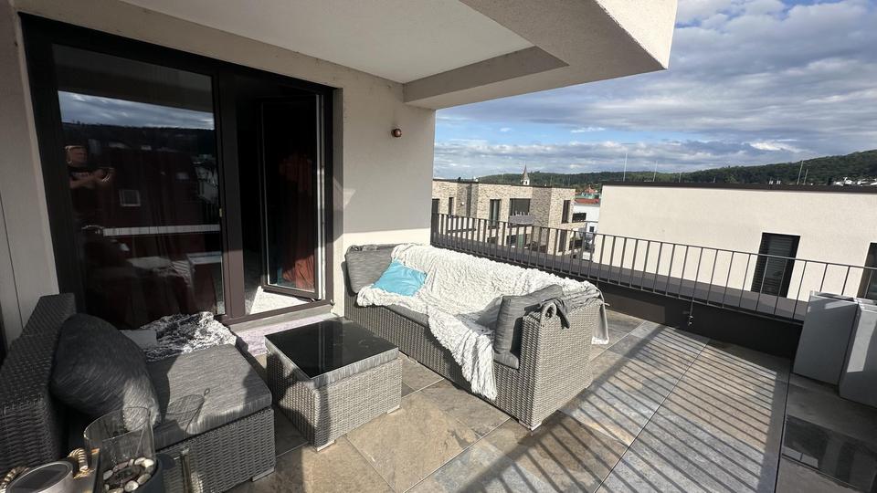 Vom Wohn-Essbereich, Küche, Haupbad als auch vom Schlafzimmer aus gelangt man auf die umlaufende Dachterrasse.